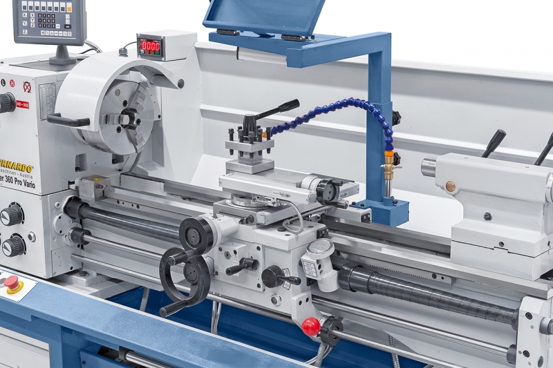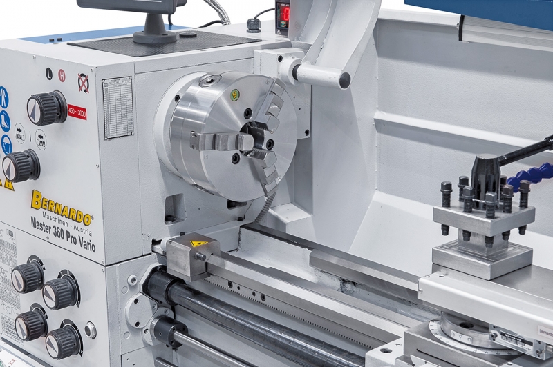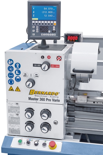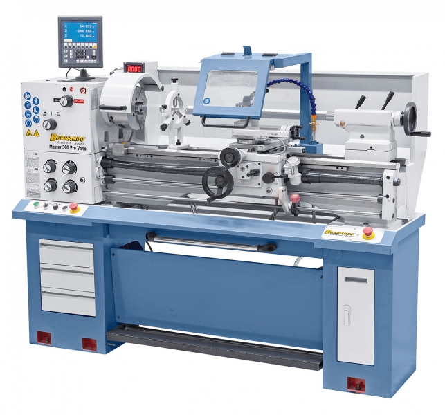 Die Master 360 Pro Vario ist eine kompakt gebaute Universaldrehmaschine mit großem Einsatzbereich und überzeugt vor allem durch den Drehdurchmesser von 360 mm, sowie der Spindelbohrung von 52 mm. Aufgrund ihrer Konstruktion (Bauart, Leistung, Vorschübe,….) kann sie sowohl in Ausbildungswerkstätten, aber auch für den Werkzeugbau und Reparaturbetriebe erfolgreich eingesetzt werden. Zusätzlich ist dieses Modell serienmäßig mit einer variablen Drehzahlregelung für ein optimales Einstellen der Schnittgeschwindigkeit ausgestattet.