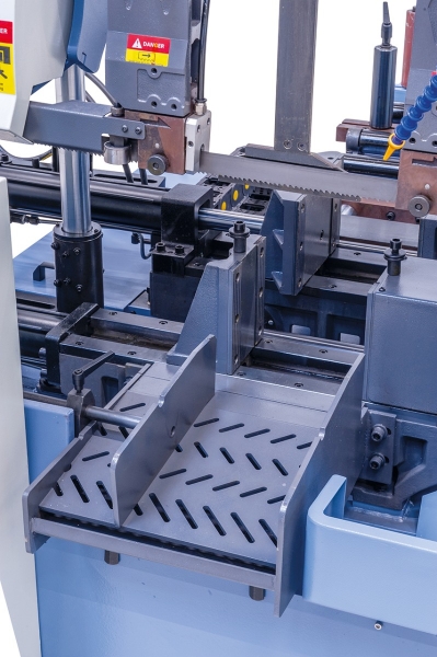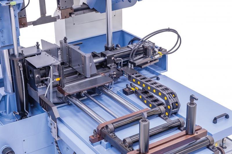 Das Modell BSM ist eine vollautomatische Metallbandsäge mit dem wesentlichen Vorteil, dass die Zustellung des Sägerahmens über eine präzisionsgeschliffene Doppelsäulenführung erfolgt. Dadurch eignet sich diese Maschine ideal zum Bearbeiten von Blöcken aus Vollmaterial. Zusätzlich ist dieses Modell mit einer hydraulischen Bündelspanneinrichtung zum Schneiden von Materialpaketen ausgestattet.