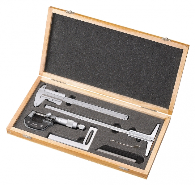 Messwerkzeuge aus Edelstahl, rostfrei mattverchromt, in Holzkassette