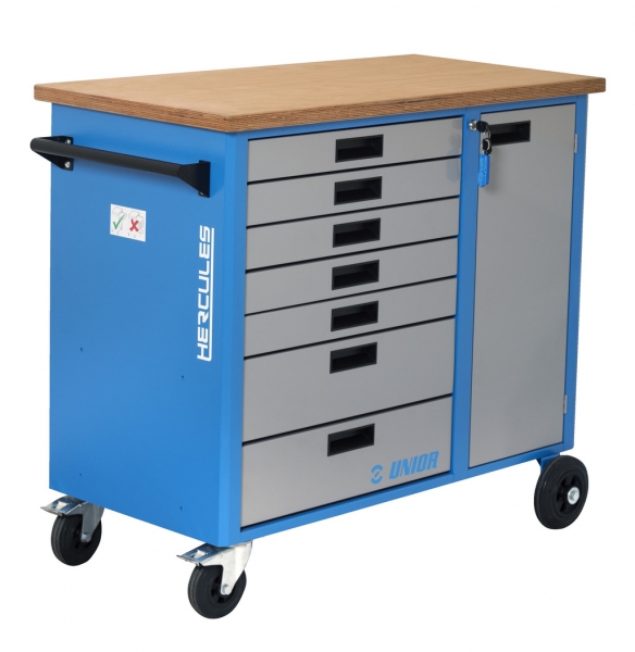 Az Unior Hercules 940H4 szerszámkocsi egy nagy kapacitású, prémium minőségű tárolási megoldás, amelyet igényes professzionális környezetekre szabtak. Ez a prémium PLUS lemezből készült szerszámkocsi központi zárrendszerrel rendelkezik, amely egy összecsukható kulccsal rendelkezik, és olaj- és saválló görgőkkel van felszerelve, amelyek közül kettő fékkel rendelkezik a nem kívánt elmozdulás megakadályozására. A masszív, 1182 x 640 x 955 mm-es méretekkel, hét fiókkal és egy zárható ajtóval jelentős tárolóhelyet kínál. A Hercules 940H4 tartósságra és könnyű használatra lett tervezve, a további munkaterületet biztosító fa munkalapot és a fiókok zökkenőmentes működtetését biztosító ergonomikus fogantyúkat tartalmaz. Az Unior SOS szerszámtálcákkal kompatibilis, lágy zárómechanizmussal ellátott, teljesen kihúzható fiókok össztérfogata 133 liter, és egyenként akár 45 kg-ot is elbírnak. Környezetbarát Qualicoat bevonata hosszú távú színtartósságot biztosít, míg a tartozékok széles választéka fokozza a funkcionalitást. A 2300 kg statikus és 550 kg dinamikus teherbírása alkalmassá teszi a nagy igénybevételű alkalmazásokhoz. A Hercules 940H4 olyan szakemberek számára készült, akiknek robusztus és megbízható szerszámtárolásra van szükségük.