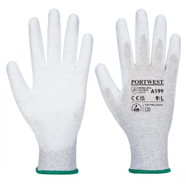 13g pylon és szénszálból készült ESD antisztatikus munkavédelmi kesztyű, PU (poliuretán) kopásálló tenyérbevonattal van ellátva az elektronikai ipar számára. A munkakesztyű anyaga megakadályozza az elektromos feltöltődést, a tenyérbevonat fogásbiztonságot, a kézhát pedig jó szellőzést biztosít. Használható a legtöbb érintőképernyős eszközzel. Tökéletes választás összetett feladatokhoz, elektronikai szerelési, tesztelési és precíziós munkákhoz. Az A198 cikkszámú védőkesztyű tenyér bevont változata.