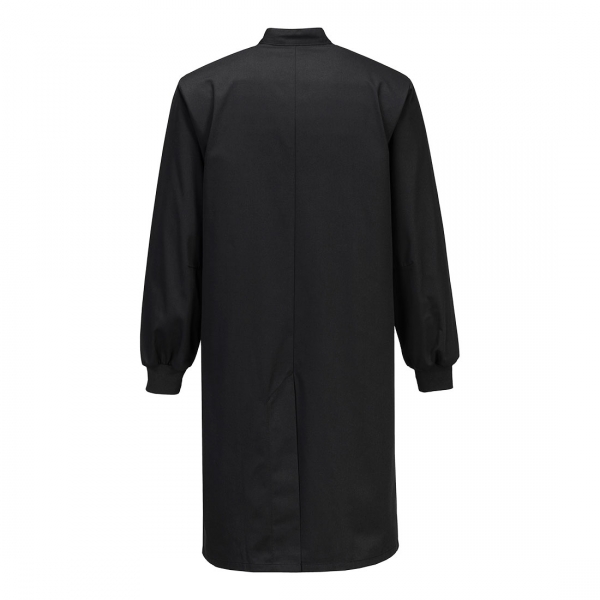 ESD környezetben történő használatra alkalmas kabát, amely az EN 61340-5-1 szabvány szerint tesztelt, gépben mosható (60°C), tartós poliészter/pamut szövettel, szövetbe szőtt szénszálakkal (ESD és antisztatikus tulajdonságokat biztosítanak), a könnyű nyitás érdekében hat sor patenttal, meleget és extra komfortot biztosító bordás mandzsettával, 3 sokoldalú, praktikus tárolózsebbel, tolltartó zsebbel, 2 combzsebbel és CE minősítéssel rendelkezik.
