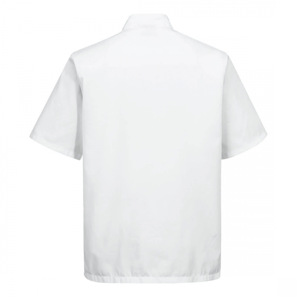 Meleg munkakörnyezetre tervezett, séfek részére tervezett rövidujjú kabát, mandaringallérral, többfunkciós, stílusos unisex fazonban. Klasszikus szabású, magas minőségű, könnyen kezelhető munkaruha modell, kopásálló, tartós, színtartó anyagból készül, ami mosás után is megtartja méretét. Ötsoros kivitelű, cserélhető gombokkal rendelkezik, valamint egy zsebbel van ellátva a biztonságos tárolás érdekében.