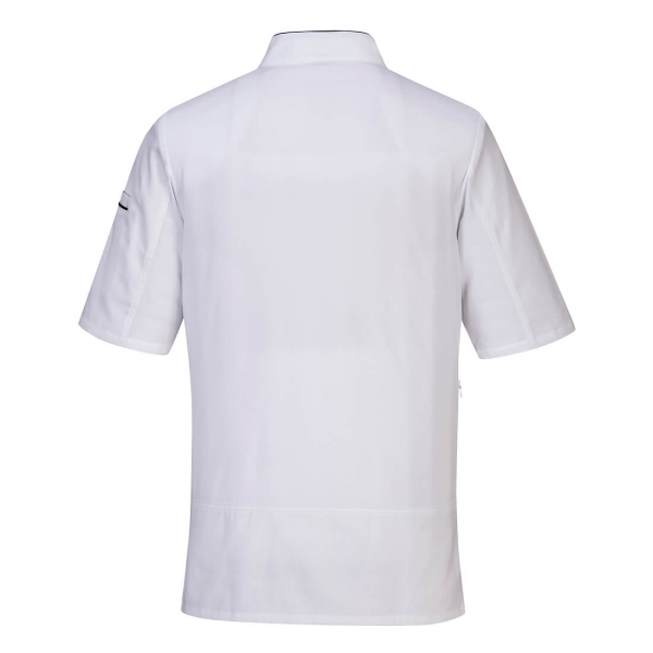 Ez a séfkabát könnyű anyagból készült, és modern, karcsúbb sziluettet kínál ergonomikus illeszkedéssel. A kabát jellemzői közé tartozik a dupla mellkasú, rejtett szegecses elülső záródás, a cipzáras oldalzseb és a nagy MeshAir Pro panelek a háton és a hónaljban a kiváló légáteresztő képesség érdekében. 100% pamut alapanyagból készült a magasabb komfort és lélegzőképesség érdekében, Prémium folttaszító bevonat, mely taszítja az olajat, a vizet és a szennyeződéseket., MeshAir™ szellőzőhálós szövet a légáramlás fokozására, Slim fit design a kivételes komfortért, Rejtett patentos elülső rész a könnyű hozzáférésért, Rejtett cipzáros zseb, 3 sokoldalú, praktikus tárolózsebbel, Új modell