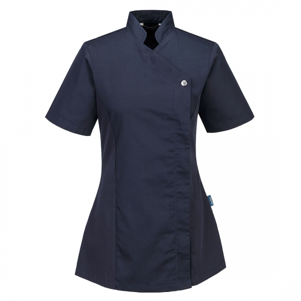 Tartós poliészter/pamut szövet női tunika, amely alapanyaga nem zsugorodik, megőrzi a termék eredeti méretét a mosások után. A kulcs fontosságú részeken innovatív rugalmas panelekkel, Action hátrésszel, oldalsó szellőzőnyílásokkal, mandarin gallérral és egy könnyen hozzáférhető elülső cipzárnyílással rendelkezik. A termék gépben mosható 60°C-on.