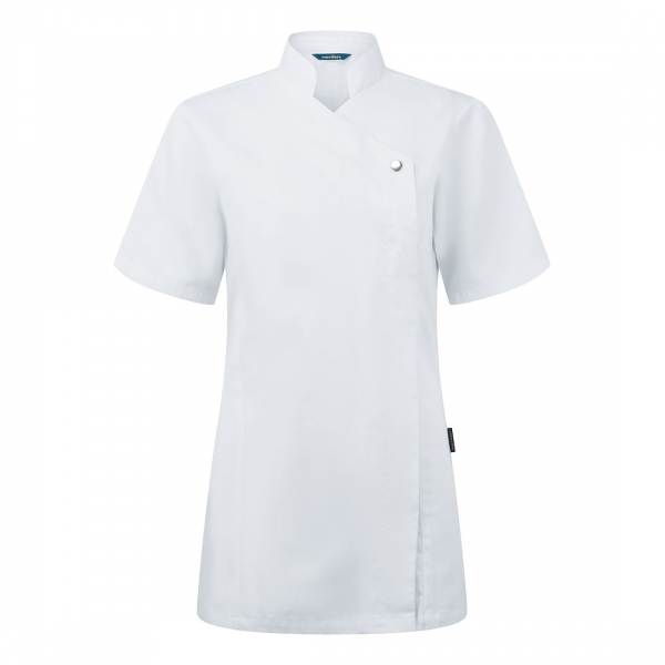 Tartós poliészter/pamut szövet női tunika, amely alapanyaga nem zsugorodik, megőrzi a termék eredeti méretét a mosások után. A kulcs fontosságú részeken innovatív rugalmas panelekkel, Action hátrésszel, oldalsó szellőzőnyílásokkal, mandarin gallérral és egy könnyen hozzáférhető elülső cipzárnyílással rendelkezik. A termék gépben mosható 60°C-on.