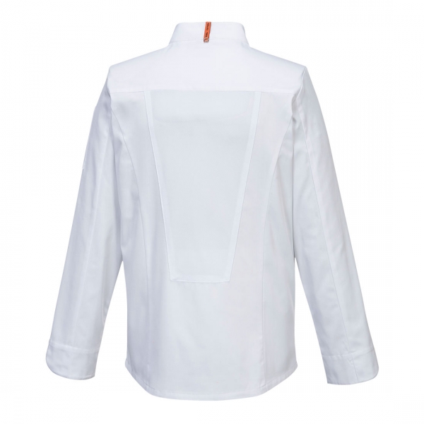 Ez a séf kabát ergonomikus viseletett és karcsú sziuletett biztosít. Dupla gombos rejtett zárodás. Kötény akasztó fül a nyak hátsó részén. A nagy méretű MeshAir Pro panelek amik kiváló légáteresztést biztosítanak. Rejtett patentos záródás Francia mandzsetta Ujjzseb MeshAir™ szellőző hálós kialakítású Poliészter/Pamut Texpel szövet. 1 ujjzseb. Slim fit szabás.