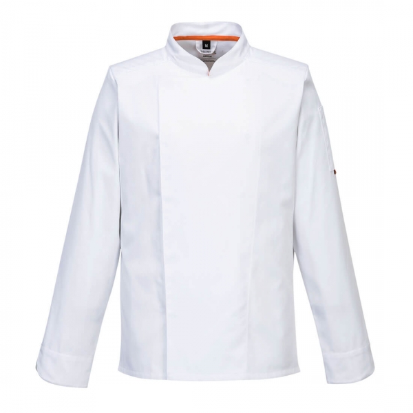 Ez a sztreccs séfkabát könnyű anyagból készült, és modern, karcsúbb sziluettet kínál ergonomikus illeszkedéssel. A dzseki jellemzői közé tartozik a kétmellű, rejtett patentos elülső záródás, a kötényfül a nyak hátsó részén, valamint a nagyméretű MeshAir Pro szellőző háló a háton és a hónaljban a kiváló légáteresztő képesség érdekében. MeshAir™ szellőző háló a hónalajnál, amely növeli a légáramlást Tartós poliészter/pamut szövet, mely nagy teljesítményt és maximális viselési komfortot biztosít Rejtett patentos elülső rész a könnyű hozzáférésért Slim fit design a kivételes komfortért A külső akasztófül biztosítja a kötény biztonságos elhelyezését 1 zseb a biztonságos tárolás érdekében Prémium folttaszító bevonat, mely taszítja az olajat, a vizet és a szennyeződéseket. Új modell