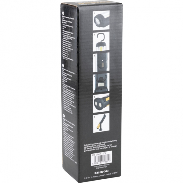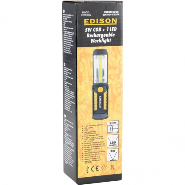 2 db világítás: COB munkalámpaként, és 1 db LED-es világítás a tetején zseblámpaként * 160 lumen * ABS műanyag gumírozott felülettel * Fénynyaláb távolsága: 20 m * Behajtható akasztóhorog * USB és mikro-USB portok * USB töltőkábelt tartalmaz * Beépített mágnes a hátlapon * Állítható mágneses alsórész * Üzemidő: 3-4 óra * Töltési idő: 5-6 óra * IPx4 * 1 db Li-ion akkumulátort tartalmaz