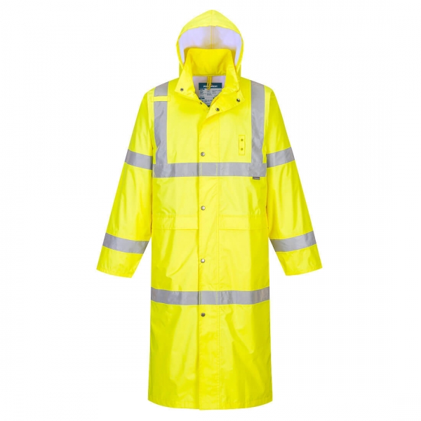 Könnyű, hosszú kabát, mely a teljes hosszán védelmet biztosít. Jól láthatósági vízálló védőruházat.