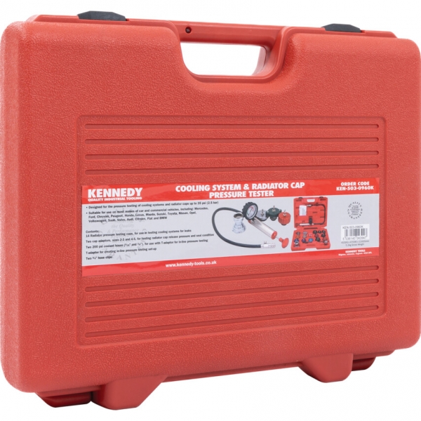Hűt'rendszerek és hűt'sapkák nyomásának ellen'rzésére tervezték 35 psi (2.5 bar) nyomásig. Alkalmas a legtöbb személygépkocsihoz és haszongépjárműhöz, beleértve a Mercedes, Ford, Chrysler, Peugeot, Honda, Lexus, Mazda, Suzuki, Toyota, Nissan, Opel, Volkswagen, Saab, Volvo, Audi, Citroën, Fiat és BMW gyártmányokat.