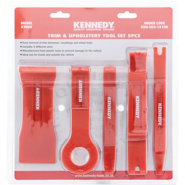 5 darab hajlított szerszámot tartalmazó készlet, amelyek segítségével könnyen eltávolíthatóak a gépjárművek beltéri alkatrészei, a díszít'léc és dísztárcsák. Ideális a gépjármű belsejében és külsején való használatra, az eszközök műanyagból készülnek, a fém, fa és kárpitanyagok megkarcolásának elkerülése érdekében.