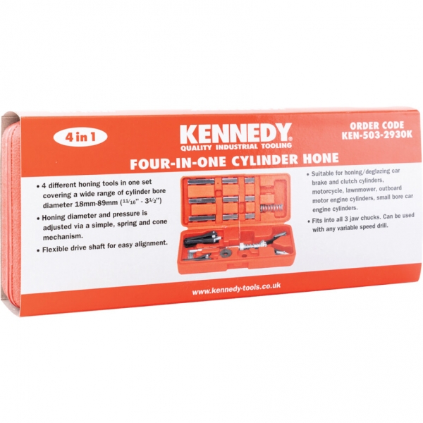 4 különböző hónolószerszám egy készletben henger furatok széles tartományát lefedve 18-89 mm-ig (11/16"-31/2"). A hónolás átmérője és nyomása egy egyszerű, kúpos és rugós mechanizmussal állítható. Önbeálló, flexibilis tengely. Alkalmas gépkocsi fék és kuplung hengerek, valamint motorkerékpár, fűnyíró és kisebb furatú szgk. dugattyúhengerek hónolására/ máztalanítására. Befogható bármilyen 3 pofás tokmányba, használható állítható sebességű fúrókkal.