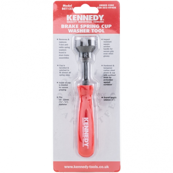 A dobfék szerelvényekben található T-hornyos kotyogásgátló rugós alátétek eltávolítására és cseréjére használják. Edzett és megeresztett karbonacél szár és fej oxidált, korrózióálló kivitelben. A lesarkalt és hornyolt fej 16-22 mm (5/8"-7/8") átmérőt fog be. Ütésálló, négyszögszelvényű nyél, mely olajosan/zsírosan is biztos fogást nyújt.