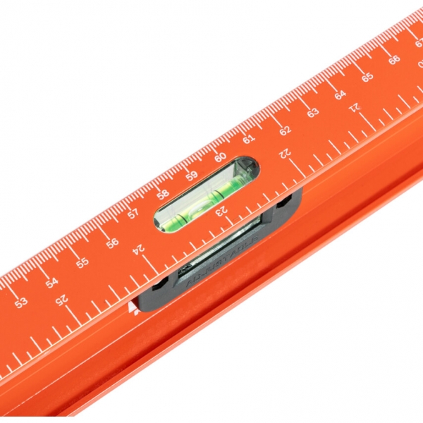 Könnyű alumíniumtest porbevonatú felülettel. 1 vízszintes, 2 függőleges libella. Ütéselnyelő zárósapka. Mart munkafelületek a precíz mérésekhez. A profilszerkezet miatt erős és tartós. Vonalzóskála a könnyebb jelölésekhez.