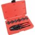 Könnyedén cserélhet' pofákkal ellátott saruzó fogó, az -n saruzási igyényeinek megfelel'en. Reteszelt préskerettel és állítható présnyomással. -t cseréhet' edzett és megeresztett karbonacél pofa, kábelsarukhoz, csatlakozókhoz, cs'hüvelyekhez és záróhüvelyekhez. Ütésálló műanyag hordtáskában.