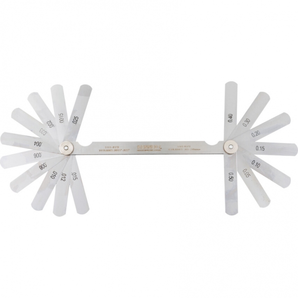 18 lapos:- 0.05, 0.1, 0.15, 0.2, 0.25, 0.3, 0.4 és 0.5 mm. 0.0015", 0.002", 0.003", 0.004", 0.006", 0.008", 0.010", 0.012", 0.015" és 0.025".