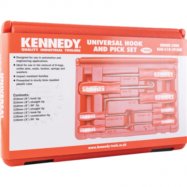 Garázsipari és más műhelymunkákra. Alkalmas O-gyűrűk, sasszegek, tömítések, perselyek, rugók és alátétek eltávolítására. Ütésálló markolat. Tartós fröccsöntött műanyag dobozban.