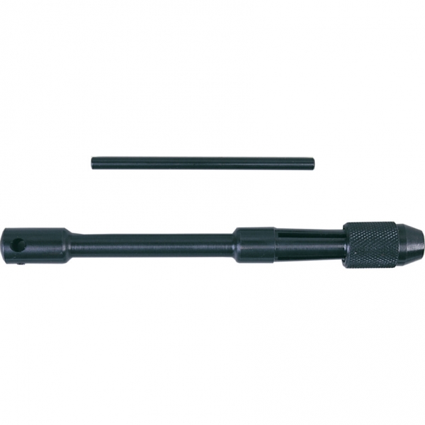 Kézi menetmegmunkáláshoz. Alkalmas nehezen hozzáférhet' helyek elérésére is. Szívós acél szerszámtest recézett tokmánnyal. 4 szorító pofa a menetfúró központos szorítására és csúszórudas markolat.