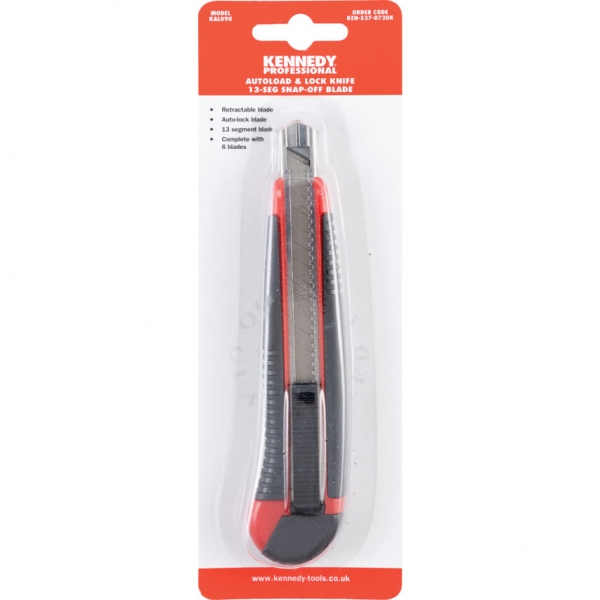ABS műanyag ház gumi bevonattal a jobb fogás érdekében, acél pengesín, mely megakadályozza a penge megcsúszását vagy a ház elhasadását. Törhető késpenge. Egyedi rugóterhelésű automatikus pengecsere.