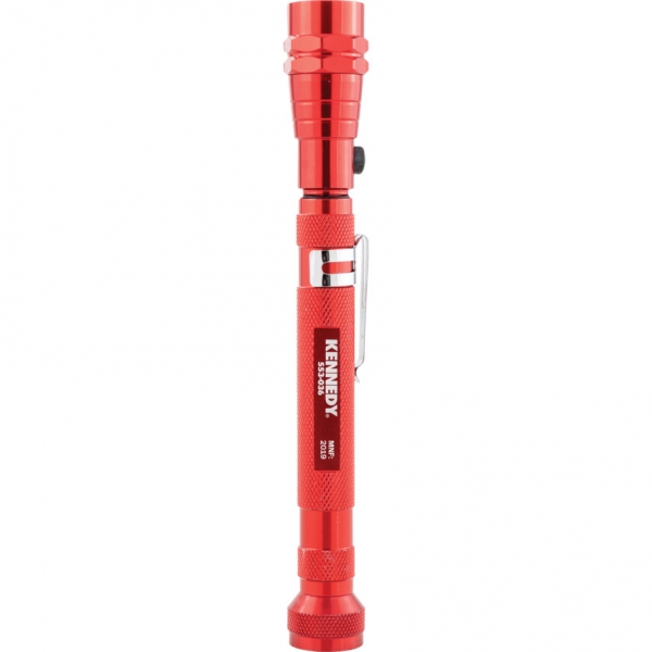 Teleszkópos, rugalmas fejjel, a felső és az alsó részre szerelt mágnesekkel. Beépített LED világítással. Recés markolat. Zsebméretű. Övre csatolható. 2,27 kg mágneses húzóerő. 4 db LR44 elemet és elemvédőt tartalmaz.