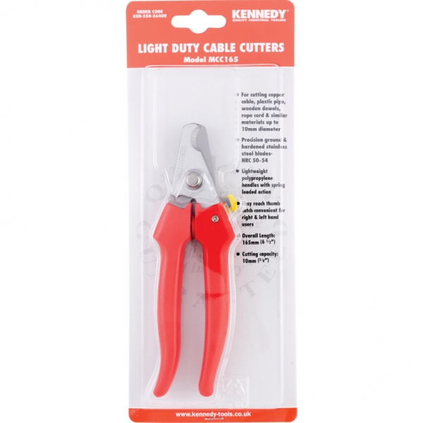 Vörösréz kábelek, műanyag csövek, faékek, huzalok és hasonló anyagok vágásához egész 10mm átmérőig. Edzett és köszörült rozsdamentes vágóélek. Keménység: 50 - 54 HRC. Könnyű, polipropilén markolat, nyitórugóval és ujjal működtetett retesszel. Teljes hossz: 165mm (61/2"). Vágási teljesítmény: 10mm (3/8”).
