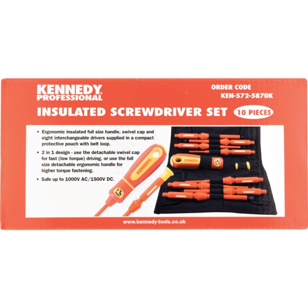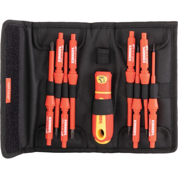 Ergonomikus, teljes markolatú szigetelt nyéllel, forgófejes nyéllel és nyolc cserélhető behajtófejjel, kompakt kivitelű, tartófülekkel ellátott védőtokban.Biztonságos 1000V AC/1500V DC feszültségig.