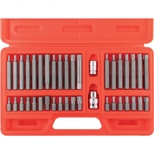 Erősített készlet műhelyek és gyártósorok számára. Króm-molibdén acélból készült hegyek. A készlet tartalmaz rövid és hosszú TORX, XZN ill. hatszög hegyeket és 3/8" és 1/2" meghajtókat. A készlet kézi és gépi meghajtással is használható.