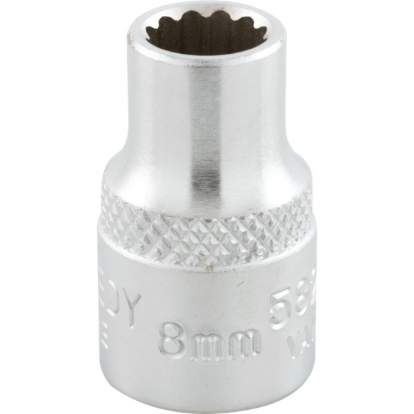 12 szögű kivitel amely nagyobb nyomatékot eredményez. Krómozott, polírozott, króm-vanádium acél. Belül letört élekkel a csavarfejekre való gyors ráfogás érdekében. Bels' négyszög minden oldala horonnyal.