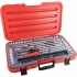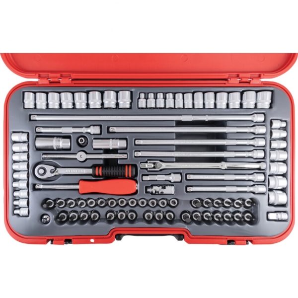 Pozidriv® No 1, 2 és 3. Torx® T6, T7, T8, T9, T10, T15, T20, T25, T27, T30, T40, T45 és T50. Hatszög. 3, 4, 5, 6, 8 és 10 mm. 1/8”, 5/32”, 3/16”, 7/32”, 1/4”, 5/16” és 3/8”. AF. Gyertyakulcsok: M10 és M14. Kiegészítők: racsnis hajtószár, csavarhúzó markolatú hajtószár, csuklós hajtószár, T-hajtószár, univerzális csukló, 75, 125, 150, 250, 300 és 450 mm-es standard hosszabbító, 150 és 250 mm-es gömbvégű hosszabbító, 1/4" és 1/2"-os külső négyszög átalakítók és 1/4"hatszög átalakító. Patentra csukódó erős tárolódoboz, ergonomikus fogantyú, lakatfül.