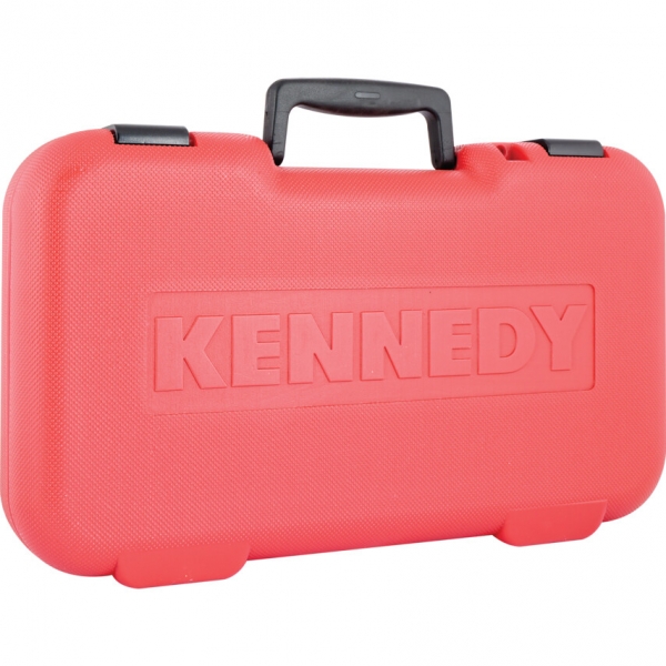 standard hosszabbító, 250 mm-es gömbvégű hosszabbító, 1/4" és 1/2"-os küls' négyszög átalakítók és 1/4"hatszög átalakító. Patentra csukódó er's tárolódoboz, ergonomikus fogantyú, lakatfül.