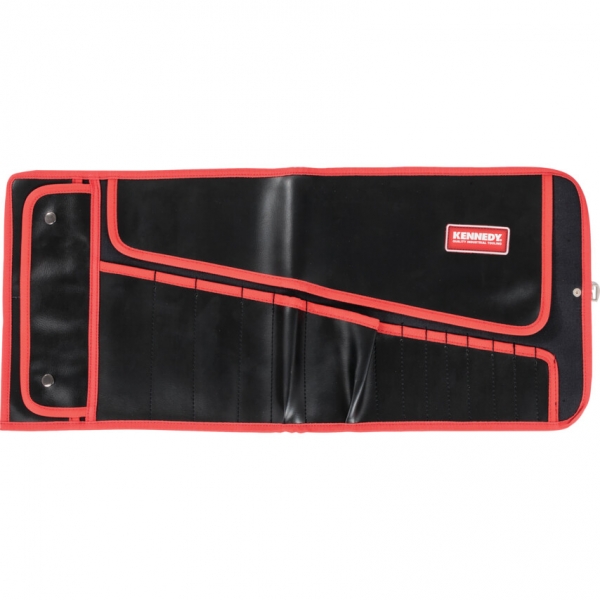 Szúrás- és rothadásálló PVC külső borítás, erős nejlon-szövet belső. 100%-ban vízálló, könnyen tisztítható. 12 lapos és két magasított zseb. A tasak végén nagyméretű, kétrészes, patent zárású tároló zseb. Felhajtható lap amely nem engedi kicsúszni a szerszámokat. Bőr zárószíj fém csattal.