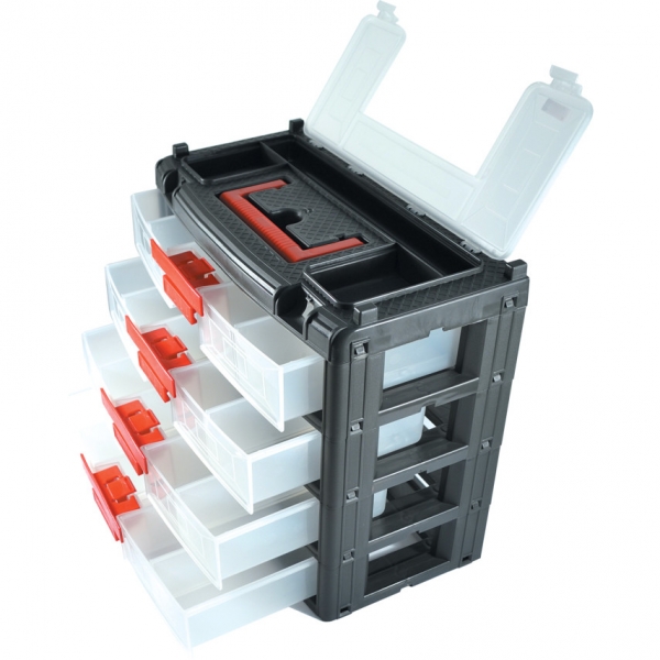 Erős, ütésálló polipropilénből készült, átlátszó fiókokkal. Három rekeszes felső tároló átlátszó fedéllel és műanyag kampós csattal. Szállítás során rögzíthető fiókok, mindegyik három áthelyezhető elosztólappal. Elrejthető hordózófül és rögzítőcsapok több szekrény egymásra helyezésének érdekében.