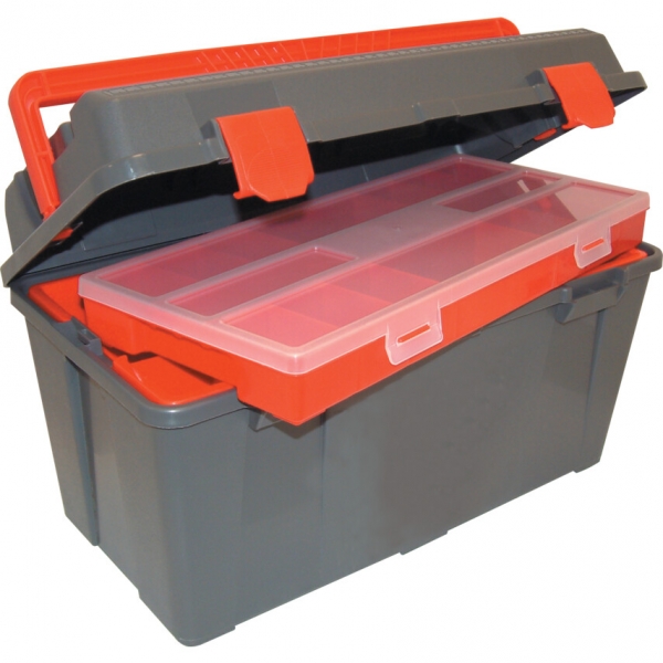 Er's, ütésálló polipropilénb'l készült doboz. Bels', nyolc rekeszes szállítótálca, elrejthet' fogantyúval és 16 rekeszes szortírozóval. A szortírozó átlátszó fedéllel. Rögzít' csatokkal, vonalzóval a fedélen és hordozó füllel amely lezárja a fedelet amikor felemeljük. Lakattal zárható. Zongora pánt (végigér a teljes nyítási felületen).