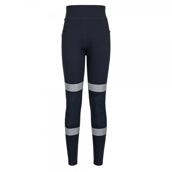 4 irányban nyúló anyaggal, hőillesztett, szegmentált fényvisszaverő szalaggal, magas derékkal és 2 zsebbel rendelkező női leggings, amelyet hevederrel való használatra terveztek.