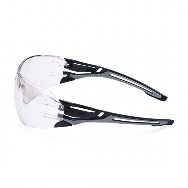 A panorámás kilátásért wrap-around stílussal, stílusos és egyedi dizájnnal, befecskendezett, kétszínű és rendkívül rugalmas szárakkal, kivételesen jó, univerzális illeszkedéssel, puha gumírozott szárvégekkel, formázott orr-résszel, karcolásgátló és párásodásgátló bevonattal, UV védelemmel, kisker kihelyezést segítő csomagolással, automatákhoz egyedi csomagolással és CE minősítéssel rendelkező könnyű védőszemüveg, amely 100% fémmentes.