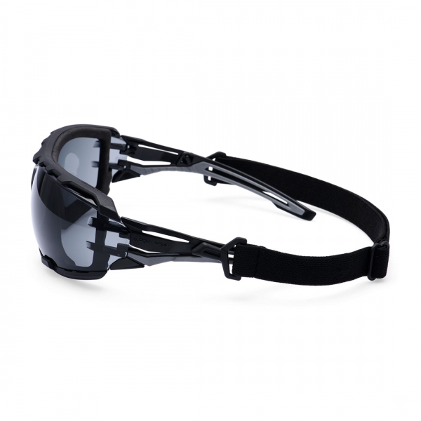 Széles állítható fejpántokkal, belső habszivacs tömítéssel, a panorámás kilátásért wrap-around stílussal, befecskendezett, kétszínű és rendkívül rugalmas szárakkal, kivételesen jó, univerzális illeszkedéssel, formázott orr-résszel, karcolásgátló és párásodásgátló bevonattal, UV védelemmel, kisker kihelyezést segítő csomagolással, automatákhoz egyedi csomagolással és CE minősítéssel rendelkező védőszemüveg, amely 100% fémmentes.