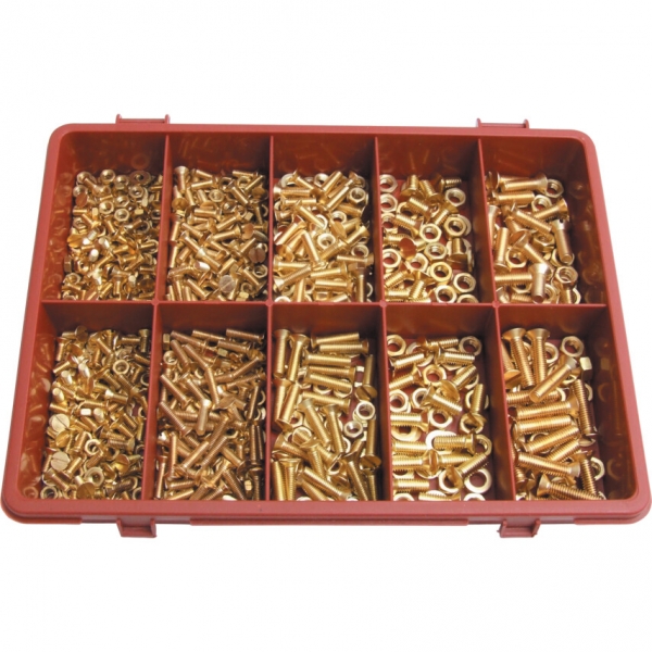 SÁRGARÉZ EGYHORNYÚ SÜLLY. FEJŰ TÖVIGMENETES ANYACSAVAR ÉS ALÁTÉTGYŰRŰ KÉSZLET