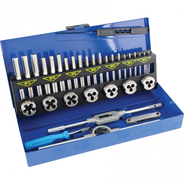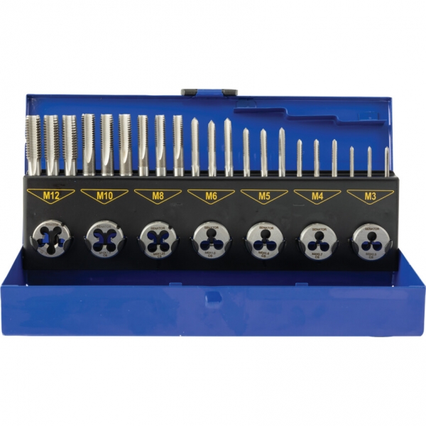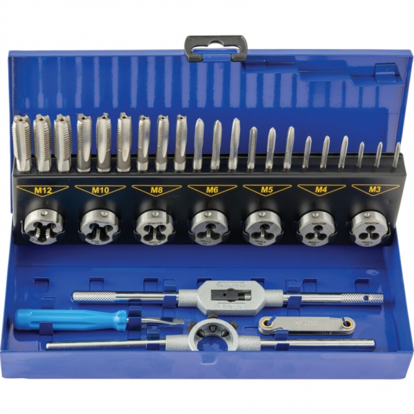 32 darabos készlet, géppel köszörült szénacél menetfúrókkal és menetmetszőkkel, fémdobozos kiszerelésben. Kizárólag általános műhely- és karbantartási használatra.