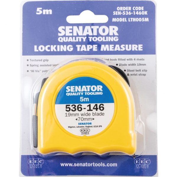 Ütésálló műanyag ház csúszó szalagzárral. Zárórugóval segített szalagvisszafutás. Fém akasztóhorog szegecsrögzítéssel. Acél övakasztó és csuklószíj. A szalagzár a kívánt helyzetben rögzíti a szalagot. Erős, korrózióálló szalag és akasztóhorog. Az önbeálló horog biztosítja a belső és külső mérések pontosságát. Az 5 m-es és annál hosszabb mérőszalagok akasztóhorgait négy szegecs rögzíti (a 3 m/10' mérőszalagét kettő).