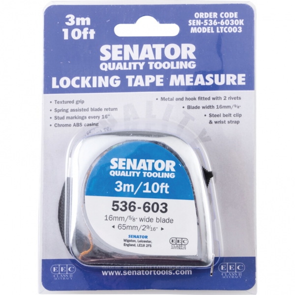 Ütésálló műanyag ház csúszó szalagzárral. Zárórugóval segített szalagvisszafutás. Fém akasztóhorog szegecsrögzítéssel. Acél övakasztó és csuklószíj. A szalagzár a kívánt helyzetben rögzíti a szalagot. Erős, korrózióálló szalag és akasztóhorog. Az önbeálló horog biztosítja a belső és külső mérések pontosságát. Az 5 m-es és annál hosszabb mérőszalagok akasztóhorgait négy szegecs rögzíti (a 3 m/10' mérőszalagét kettő).