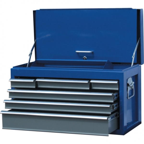 0.8mm vastag acéllapokból készült 0.6mm vastag acéllemez fiókokkal. Kétrészes epoxy bevonatos kék/szürke felület, krómozott PVC fogantyúkkal. Lehajtható/zárható fedél amely eltakarja a fiókokat. 250mm hosszú görgős csúszósínek. Szerszámtároló tálcával.