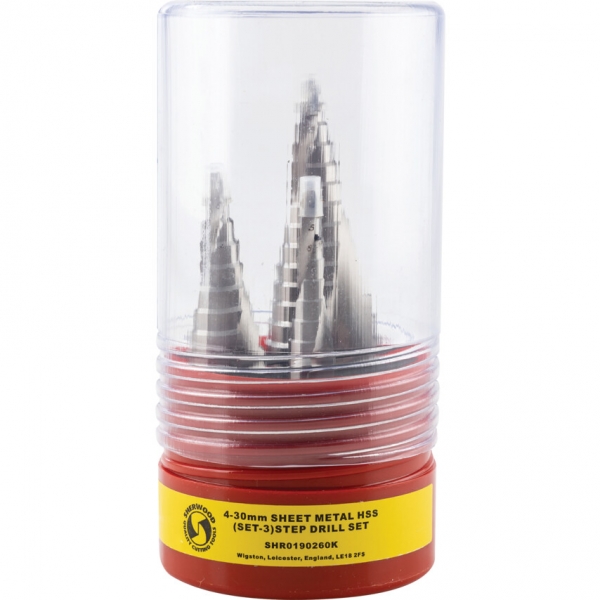 Három darabos lépcs's fúró készlet gyorsacélból gyártva, mely hosszú szerszámélettartamot és extra tartósságot biztosít. Mindegyik lépcs' egy adott méretű egytengelyű furat el'állítására alkalmas, a megmunkálható anyag vastagságát a lépcs' hossza határozza meg. A fúrók alkalmasak furatok készítésére vagy b'vítésére fémlemezekben központozás vagy el'fúrás nélkül. Használhatók szerszámgépeken vagy oszlopos fúrógépeken ipari alkalmazások széles skálájára.