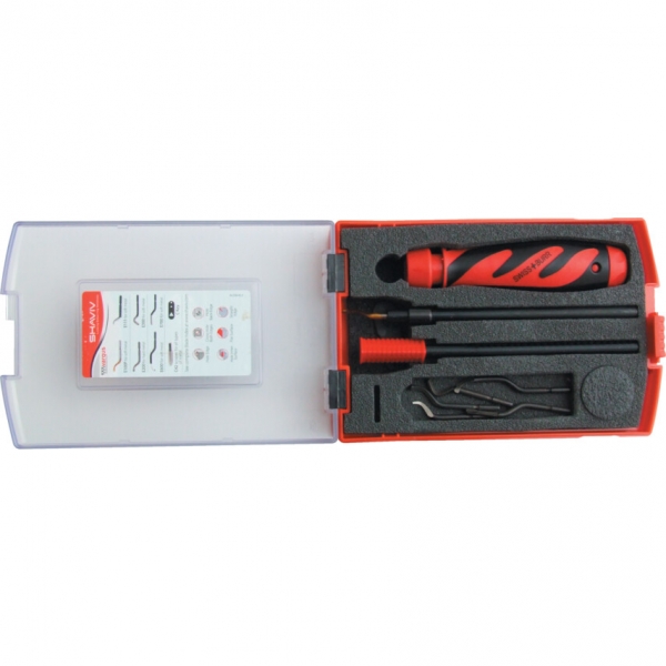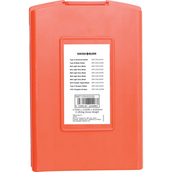 A készlet tartalma: SWISS+BURR™ 1 db A típusú univerzális nyél, 1 db B típusú késtartó, 1 db B10, 1db B11, 1 db B20 TiN, 1 db B30, 1 db B60, 1 db B70 keményfém hegyű, 1 db C fémhántoló és 1 db C40 háromszögletű fémhántoló.