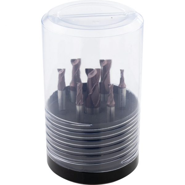 Középpontba futó vágóél. A Gyártók szabványai szerint. DIN1835B el'írásainak megfelel' Weldon szár. A szár átmér'je h6 tűrésű. Méretek a DIN 844 szabvány szerint. A készlet tartalma: 3, 4, 5, 6, 8, 10 és 12 mm.