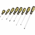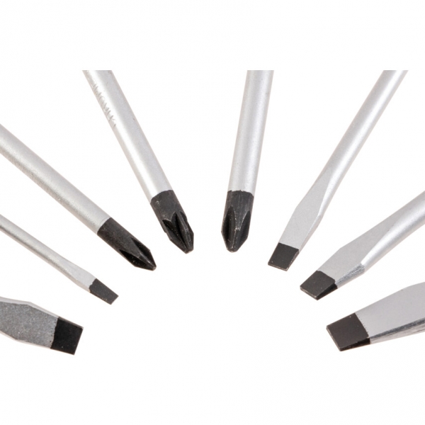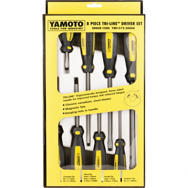Tri-LineTM csavarhúzó készletek. Ergonomikus, kétkomponensű, háromszög keresztmetszetű markolat a nagyobb nyomaték- átvitel érdekében. Króm-vanádium penge, mágneses éllel. Akasztó lyuk a markolat végén. Méretek feltüntetve a markolatokon a könnyebb azonosítás végett.