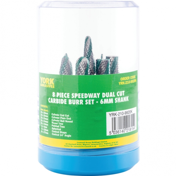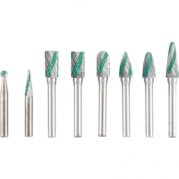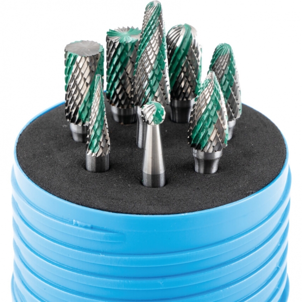 Egyedi kialakítású fogazás: váltakozó finom fogazás és durva fogazás, melynek köszönhet'en gyorsabb az anyageltávolítás, de megmarad az egyenletes felületi simaság. A készlet tartalma: 10x19 mm hengeres homlokfogazású, hengeres homlokfogazás nélkül, hengeres gömbvégű, ívelt gömbvégű, ívelt hegyes végű, 6x5 mm gömb alakú, 6x19 mm kúpos, 10x27 mm kúpos 14°-os.